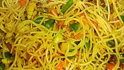 - Chow mein - A popular dish combining noodles, vegetables, scrambled egg, ginger and garlic, soy sauce, green chili sauce, red chili sauce and vinegar