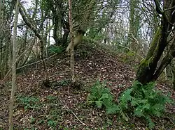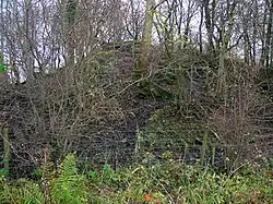 Ladyha No 2 pit was sunk in 1885 to a depth of 568 feet (173 m) and closed in May 1934, having struggled since its main customer, the Eglinton Iron Company, closed in 1928. A fairly substantial brick-lined tunnel still survives which once carried a standard gauge railway line unobtrusively to Ladyha colliery, out of the Earl's sight and the smoke kept away from the kitchen gardens' greenhouses and plants.[38] Other such cosmetic tunnels exist at Alloway and near Culzean Castle.[39] The tunnel was used during World War II as a bomb shelter and storage area for furniture; it remains in good condition. The old colliery ruins were razed to the ground in 2011, having been assessed as a danger to the public.