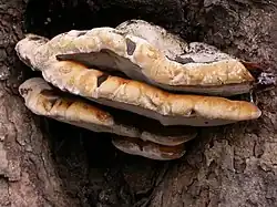 Inonotus arizonicus is a plant pathogen. I. arizonicus is a locally common saprotrophic polypore that induces white rot in sycamore trees in southwestern North America.[1] Host species include Platanus wrightii (Arizona sycamores) and Platanus racemosa (California sycamores).[2] The fruiting bodies, shaped like hooves or a plate or a stack of plates, can appear on trunks, at the base of living trees, or on stumps or snags.[3] In California this species is generally found south of the San Francisco Bay Area.[4]