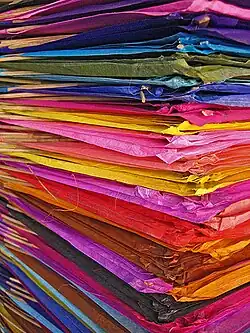 During the event, kite markets are set up alongside food stalls and performers. They are usually made with materials such as plastic, leaves, wood, metal, nylon and other scrap materials, but the ones for Uttarayan are made of light-weight paper and bamboo, and are mostly rhombus shaped with a central spine and a single bow.[18] Dye and paint are also added to increase the glamour of the kite. The lines are covered with mixtures of glue and ground glass which, when dried, rolled up and attached to the rear, also known as firkees, become sharp enough to cut skin.[17] These types of sharp lines are used on fighter kites, known in India as patangs, to cut down other kites during kite fighting events.