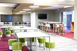 The 19-acre campus includes three libraries/media centers, a 400-seat theater, three cafeterias, seven science labs, a design technology center, outdoor learning centers, dance and music rooms, two gyms, functional fitness center and sports fields.[3]