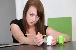 Irina Blok (born c. 1977) is a graphic designer and an artist. She is best known for the creation of the Android logo including its green robot icon.[1] She was born and raised in Saint Petersburg, Russia, until she and her parents moved to Silicon Valley, a region in Northern California, when she was 18 years old. She comes from a family of engineers, her parents and her grandparents were all engineers, making her their only graphic designer.[2]