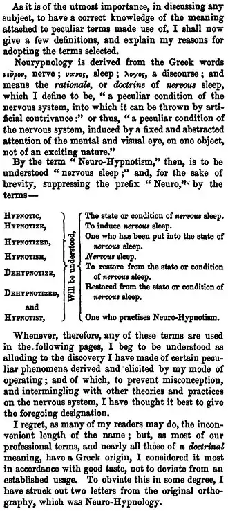 I therefore think it desirable to assume another name [than animal magnetism] for the phenomena, and have adopted neurohypnology – a word which will at once convey to every one at all acquainted with Greek, that it is the rationale or doctrine of nervous sleep; sleep being the most constant attendant and natural analogy to the primary phenomena of mesmerism; the prefix "nervous" distinguishing it from natural sleep. There are only two other words I propose by way of innovation, and those are hypnotism for magnetism and mesmerism, and hypnotised for magnetised and mesmerised.