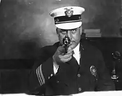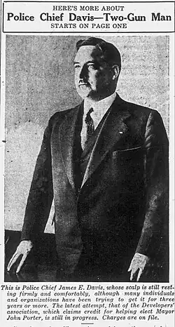 James E. Davis made a name for himself as the head of the vice squad during Prohibition. When Chief Davis created a "gun squad" staffed with 50 policemen, he publicly announced "the gun-toting element and the rum smugglers are going to learn that murder and gun-toting are most inimical to their best interest." Davis declared that the LAPD would "hold court on gunmen in the Los Angeles streets; I want them brought in dead, not alive and will reprimand any officer who shows the least mercy to a criminal."[1] For his efforts, he won the moniker "Two-Gun Davis."