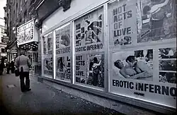 One of the other outlets on Walker's Court was an adult shop run by Bernie Silver, an established pornographer and racketeer.[21][d] In the early 1960s, while it was legal to sell softcore pornography, selling more explicit work was illegal.[11] There was no licence needed from the police or local authority.[22] Although there had only been five sex shops in Soho in 1955, that number grew markedly during the 1960s. The professor of law Colin Manchester considers the rise was because of the permissive society and the more lenient Obscene Publications Act 1959, which was less restrictive than its predecessor.[23] Silver and Humphreys began a professional relationship; Silver thought Humphreys and his wife would be a profitable investment for the future, Humphreys thought Silver could provide access and protection. Both judgements proved sound. The journalist Neil Root writes that the two men "tolerated each other, perhaps became friendly for a time", but were wary of one another.[19]