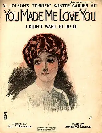 He played piano at cafes in Manhattan and at Coney Island, and wrote his first successful song, "Oh, You Circus Day", which was featured in a Broadway revue, Hanky Panky, in 1911. Further success came the following year with "Row, Row, Row" (lyrics by William Jerome) in the Ziegfeld Follies of 1912, and perhaps his best remembered song, "You Made Me Love You" (with lyrics by Joseph McCarthy), which was introduced by Al Jolson in 1913 and performed by Judy Garland with revised lyrics as "Dear Mr Gable" in 1937.[2]