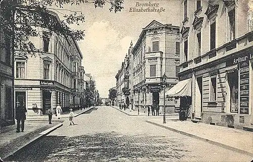 The street was defined in the mid-19th century. As a consequence of the set up in 1851, of the railway station (Polish: Bydgoszcz Główna) in the north-west of Bydgoszcz, an intensive urban development happened in order to connect this area with the historical heart of the city, Gdańska Street. It is the same process that led to the development of nearby Dworcowa Street. At that time, the street was named Elisabethstraße, along with Elisabethmarkt (now Piastkowski Plac) the plaza it crossed to the north, in honor of Elisabeth Ludovika of Bavaria, wife of the reigning the King of Prussia Frederick William IV of Prussia.