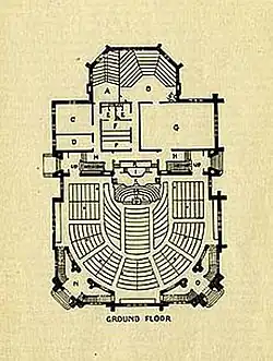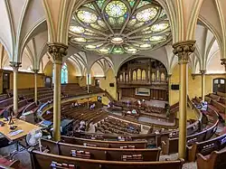The Jarvis Street Baptist Church was designed in the Gothic Revival style by the architectural firm of Henry Langley and Edmund Burke who served for many years at Jarvis Street Baptist Church as a Sunday-school teacher, chair of the choir committee, and deacon. It was one of the first churches in Canada to be built with an amphitheatre-shaped interior. The ground floor seating is grouped in a semicircle, while the gallery above is horseshoe shaped. The gallery is supported by iron columns. Above the gallery, another set of columns support a faux-Gothic ceiling.[10]