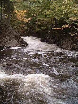 The surface of the Jaune River (except the rapids areas) is generally frozen from the beginning of December to the end of March; however, safe circulation on the ice is generally done from the end of December to the beginning of March. The water level of the river varies with the seasons and the precipitation; the spring flood occurs in March or April.
