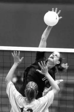 Martz earned AVCA national player of the week honors for the week of November 2, 1998, for helping Wash U earn its 10th consecutive conference championship and becoming the first player to be named UAA MVP 3 consecutive seasons.[31] In the 1998 NCAA Division III women's volleyball tournament, Martz posted 16 kills and hit .714 in a victory over Emory University.[32] Martz tallied 8 blocks and the match winning kill in a victory over Trinity University for its 10th straight NCAA regional championship.[33] The Bears were again defeated by Juanita College 13-15, 15-4, 15-7, 2-15, 12-15 at home on November 21, 1998.[29] Martz was named as an AVCA first team All-American.[34] She was a 1998 GTE/College Sports Information Directors of America (CoSIDA) second-team Academic All-American selection.[35][36] Martz was named 1999 NCAA Division III Missouri Woman of the Year based on a combination of her academic achievement, athletic excellence and community service.[37]