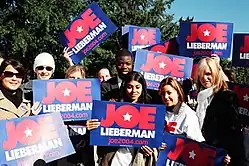The 2004 presidential campaign of Joe Lieberman, the long-time United States senator from Connecticut and the vice-presidential nominee under Al Gore in the previous election, began on January 13, 2003, when he announced his intention to seek the Democratic nomination as a candidate in the 2004 presidential election. Describing his presidential hopes, Lieberman opined that his historically hawkish stance would appeal to voters. Prior to his defeat in New Hampshire, Lieberman famously declared his campaign was picking up "Joementum".[1] On February 3, 2004, Lieberman withdrew his candidacy after failing to win any of the five primaries or two caucuses held that day. He acknowledged to the Hartford Courant that his support for the war in Iraq was a large part of his undoing with voters.[2] Lieberman's former running candidate Al Gore did not support Lieberman's presidential run, and in December 2003 endorsed Howard Dean's candidacy, saying "This is about all of us and all of us need to get behind the strongest candidate [Dean]."[3]