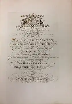 - Blackstone, William (1759). The Great Charter and Charter of the Forest, with other Authentic Instruments: To which is Prefixed an Introductory Discourse, Containing the History of the Charters. By William Blackstone, Esq; Barrister at Law, Vinerian Professor of the Laws of England, and D.C.L. Oxford: Clarendon Press. OCLC 4547269.