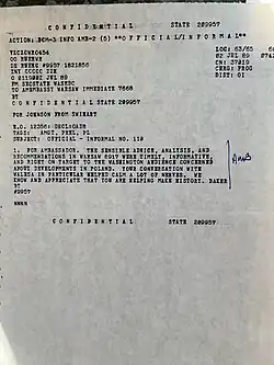 Secretary of State James Baker cabled Davis on July 2, 1989 “The sensible advice, analysis and recommendations in Warsaw were timely, informative and right on target to the Washington audience concerned about developments in Poland.  Your conversations with Walesa, in particular, helped calm a lot of nerves.  We know and appreciate that you are helping make history”.