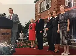 President George H.W. Bush, Secretary of State James Baker, Ambassador John R. Davis Jr. and Helen Davis at the Ambassador's residence, Warsaw, Poland for July 1989 historic luncheon.