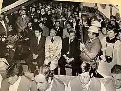 John R Davis Jr. at memorial mass on first anniversary of Father Popieluszko's death, October 1985. Lech Walesa and Tadeusz Mazowiecki in row behind him..