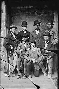 A group of walkers preparing to climb Snowdon. Thomas is part of this group, on the back row at the right with the beard.[8]