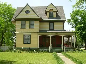 The John W. Gibson House, constructed in 1896, is a three-story Dutch Colonial Style Home owned and built by John Gibson, cattleman and banker. It was listed on the National Register of Historic Places in 1982. The house is one of the oldest pre-statehood houses in Wagoner. Gibson was president of the First National Bank in Wagoner for 26 years.[2][3] The home features three stories plus a basement. From an opening in a third story bedroom floor, a brass fireman's pole serves as an emergency fire exit for the two bedrooms, loft and bath on the third story. The fireman's pole lands in the middle of the second story library nook. There is a wrap-around porch as well as a second porch off of the back entrance. The home was lovingly restored to historically accurate paint colors on the exterior during the early 2000s. Many of the interior fixtures have been updated, all in accordance with historical accuracy guidelines.