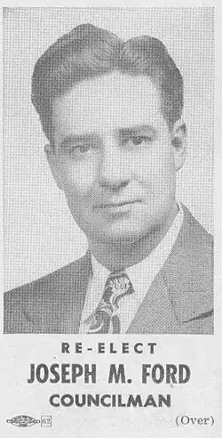 Joseph M. Ford (April 6, 1912 – September 12, 1954) was a member of the Dearborn, MI City Council from 1945-1953.[1] Ford was a resident of Dearborn for 27 years, studied in Dearborn schools and did post graduate work at the University of Detroit. He was a State Senate nominee for the state of Michigan in 1944, 1948, and 1950 under the Republican ticket.[2] Ford was a member of the Pioneers, Knights of Columbus, Moose and Eagles.
