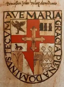Juan Vélaz de Medrano's coat of arms was listed in the official archives of the Kingdom of Navarre.[10] The Medrano family is a very ancient house of noble origin, it is found in different times and in different places. Many principles are attributed to them by authors and historians: