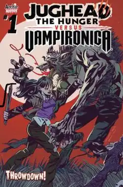 In October 2018, a crossover between the alternate reality comic books Jughead: The Hunger and Vampironica, both hailing from the Archie Horror imprint of Archie Comics, was one of two 5-issue miniseries announced by the imprint along with Blossoms 666. The limited series, titled Jughead: The Hunger vs. Vampironica, was written by Frank Tieri and illustrated by Pat & Tim Kennedy, the team that previously worked together on Jughead: The Hunger.[1] Discussing the story and means of the crossover, Tieri said, "There are no vampires in Jughead: The Hunger. Vampironica, on the other hand, has no werewolves. Now, why is that? What happened in their respective worlds to cause an entire race to be wiped out? Jughead: The Hunger vs. Vampironica answers that question as well as what happens when these elements are reintroduced once again."[2] The first issue was released on April 24, 2019.[3]