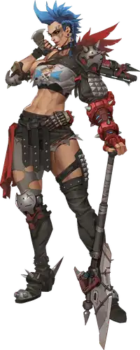 Junker Queen is an Australian woman introduced as a backstory character in the 2016 game Overwatch. First introduced in a 2017 update for the video game Overwatch, she is the ruler of "Junkertown", and directly opposed to fellow characters Junkrat and Roadhog, who she has banned from the settlement with orders to shoot them on sight.[6][15] Junker Queen did not physically appear until the game's sequel, Overwatch 2, which introduced her as a playable character upon release. Trained at a young age to fight hostile omnics roaming the Australian wasteland, she utilized parts of them to form armor, namely a large gauntlet that can manipulate electromagnetism.[16]