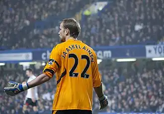 After twelve years at Bolton Wanderers, Jääskeläinen was granted a testimonial match against Hibernian in August 2009, a match attended by 13,000 fans, in which he kept a clean sheet.[174] Jääskeläinen said his target was to "earn about 12 or 13 in a season, though he expressed optimistic ahead of the new season.[173][175] At the start of the 2009–10 season, however, Bolton Wanderers did not get off to the best of starts, losing all three matches in the first month to the season despite his good performances.[176] As months goes by, results began to improve slowly, though poor results eventually saw manager Megson sacked and replaced by Owen Coyle.[177] But Jääskeläinen’s performance was a few unscathed from the club’s inconsistent form and criticism despite conceding 36 times by the time Megson left.[178] He then made his 400th Premier League appearance for Bolton Wanderers, in a 3–3 draw against Manchester City on 12 December 2009.[179] After the appointment of Coyle, he played down suggestions over reports that Jääskeläinen confronted the newly appointed goalkeeping coach Phil Hughes.[180] Under the management, he earned four clean sheets by February and helped the club climb out of the bottom three.[181] In fifth round of the FA Cup against Tottenham Hotspur, Jääskeläinen saved a penalty from Tom Huddlestone, in a 1–1 draw to earn a replay.[182] Eventually, Bolton Wanderers went on to keep their Premier League status by finishing 14th with 39 points.[183] At the end of the 2009–10 season, he went on to make forty–three appearances in all competitions. Reflecting on the season, Jääskeläinen said that Megson’s negative relationship with the club’s supporters had the effect on the season’s performance.[184]