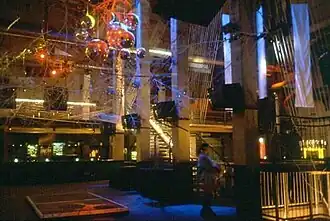 The club was located in a decommissioned cogeneration power plant of the food manufacturer Pfanni, and poured on the charm of an old industrial production site.[18] Thus it represents an early example of the reutilization of disused power plants and their robust industrial setting as techno clubs, an approach that was later followed by clubs such as Berlin's Berghain (2004), the second Tresor (2007), and Munich's MMA Club (2014).[6] The KW was subdivided into 3 levels: the main area with the main dancefloor, the upper level with the lounge area, and the basement. The hall-like main area was subdivided by several tall concrete columns and a large steel staircase, which led on to the upper level. The club housed several bars, and also had an outdoor chill-out area. Due to the geographical proximity to other popular clubs in Munich such as Ultraschall und Natraj Temple, the club had to deal with a phenomenon called club sharing.[9]