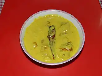 Kadhi or karhi is a yogurt-based dish originating from Rajasthan, India.[2] It is made by simmering yogurt with besan (gram flour) and spices until it forms a thick, tangy gravy. It is sometimes mixed with pakoras (deep-fried fritters). It is often eaten with cooked rice or roti.[3]