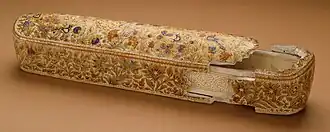 The present practice is, however, to complete the layering of pulp over the mold at one stage itself and then dry it before polishing it with gemstones. The artwork is then detached from the mold using a saw and then rejoined using dense glue.[8] The joint is then rubbed slowly with a file made of wood known locally as kathwa. The surface is polished till all irregularities and edges become smooth.[9] Then gold and silver foils are used in combination with the paste of chalk and glue mixture, which is applied to the exterior and interior surfaces of the object using a brush. After drying of the treated object, the surfaces are again polished using baked brick pieces. To prevent any cracking more paper strips are pasted and then polished again to smooth the surface, to get the colour of zamin or earth or of gold, white, black, blue or red. The surface of the object is demarcated with yellow colour, which is then followed by floral designs made in different colours in dark or light shades with application of adhesive compound called dor made of zarda, sugar and glue as adhesive, and applying gold or silver foils.