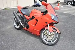 The Kawasaki Ninja ZX-12R is a motorcycle in the Ninja sport bike series made by Kawasaki from 2000 through 2006. The 1,199 cc (73.2 cu in) inline-four engine produced 178 hp (133 kW) at low speed, and increased to 190 hp (140 kW) at high speed due to its ram-air intake,[8][9][10] making it the most powerful production motorcycle up to 2006 and the release of the ZX-14.[6][11] It was a contender to be the fastest production motorcycle, and played a role in bringing to a truce the escalating competition to build an ever-faster motorcycle. Its top speed was electronically limited to 186 mph (300 km/h), tying it with the Suzuki Hayabusa and Kawasaki Ninja ZX-14 as the fastest production motorcycle on the market, after the 303–312 km/h (188–194 mph) 1999 Hayabusa was replaced with a speed-limited version as part of a gentlemen's agreement between motorcycle manufacturers that lasted until the 298–311 km/h (185.4–193.24 mph) 2007 MV Agusta F4 R 312.[3][12][13][14]