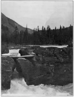 The Kicking Horse River is in the Canadian Rockies of southeastern British Columbia, Canada.[2] The river was named in 1858, when James Hector, a member of the Palliser Expedition, reported being kicked by his packhorse while exploring the river. Hector named the river and the associated pass as a result of the incident. The Kicking Horse Pass, which connects through the Rockies to the valley of the Bow River, was the route through the mountains subsequently taken by the Canadian Pacific Railway when it was constructed during the 1880s. The railway's Big Hill and associated Spiral Tunnels are in the Kicking Horse valley and were necessitated by the steep rate of descent of the river and its valley.