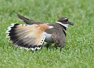 The parents use various methods to distract predators during the breeding season. One method is the "broken-wing display",[35] also known as "injury feigning".[36] Before displaying, it usually runs from its nest, making alarm calls and other disturbances. When the bird has the attention of the predator, the former turns its tail towards the latter, displaying the threatening orange color of the rump. It then crouches, droops its wings, and lowers its tail, which is more common for them.[35] With increasing intensity, the wings are held higher, the tail is fanned out, and the tail becomes more depressed.[27] Another behavior that has received attention is the "ungulate display", where the adult raises its wings, exposes its rump, lowers its head, and charges at the intruder. This can be fatal to the displaying bird.[37]