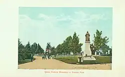 In 1862, German-speaking groups held the Sängerfest, or "Singer Festival" concert event in Berlin that attracted an estimated 10,000 people and continued for several years.[66] Eleven years later, the more than 2000 Germans in Berlin, Ontario, started a new event, Friedensfest, commemorating Prussian victory in the Franco-Prussian war. This annual celebration continued until the start of World War I.[67] In 1897, they raised funds to erect a large monument, with a bronze bust of Kaiser Wilhelm I, in Victoria Park. The monument was destroyed by townspeople just after the start of World War I.[28] A statue of Queen Victoria was erected in the park in 1911.