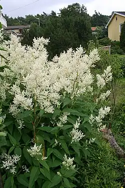 This plant is grown as an ornamental perennial. It grows to a height of 150–200 cm (4 ft 11 in – 6 ft 7 in). Flowering in June,[12][13] or July to August in far northern latitudes,[23] it has creamy white flowers which turn pink as they age. Although shrub-like in appearance, it is herbaceous, dying back to the ground over winter.[12][17] It has been described as "very good value for almost instant impact"[12] and an "eye-catcher",[9] although some people find the flower scent to be unpleasant.[9][12][23]