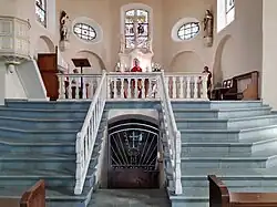 The upper church features wooden vaults, and several altars from the 18th century. The meadow around the chapel and the sexton's house is surrounded by a wall with eight sides. Seven stations of the cross along the Kreuzweg, by the Hadamar school of sculpture, are replicas of weathered originals which are held in the crypt.[1] Stained glass windows, donated by citizens of Camberg, were added around 1900.[2]