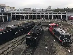 The 1914 roundhouse was built surrounding a turntable. It is an Important Cultural Property designated by the government of Japan as the oldest reinforced-concrete car shed extant in Japan.[2]