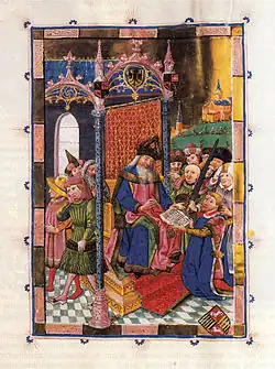 In 1355, the Duke of Lüneburg married his daughter Mechtild to her cousin Louis, the heir to the throne in the Principality of Brunswick, and appointed him as his heir and successor in Lüneburg. In the event that Louis predeceased him, William retained the right to choose a successor from his brothers. In the same year, however, Emperor Charles IV guaranteed the succession of Lüneburg on the death of William, who had no sons, to the Ascanian dukes of Wittenberg in the form of an Eventualbelehnung, a fief contingent on the death of William. Charles IV rejected the female inheritance law and regarded the fief, on the death of William, as returning to the Empire. The official appointment of William to the dukedom in 1235, in which the cognatic succession had been assured, led to further negotiations between the Duke and the Emperor, but these did not reach a conclusion. The assessment of earlier research that assumed William had originally supported the contingent enfeoffment of Albert of Saxe-Wittenberg, is regarded as unfounded in more recent research.[1] When Louis died in 1367, William appointed his brother Magnus II as his successor and made him his co-regent in the same year. When William died two years later, the Wittenbergs reaffirmed their claims to the Principality and Emperor Charles IV enfeoffed Duke Albert, his uncle Rudolf, who died shortly thereafter, and Wenceslas with Lüneburg.[2]