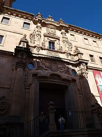 La Clerecía is the name given to the building of the former Real Colegio del Espíritu Santo (or Santo Espíritu) of the Society of Jesus, built in Salamanca between the 17th and 18th centuries. It is of baroque style. It differs the college, with an interesting cloister, and the church, with an impressive facade of three bodies. The name of Clerecía is due to an abbreviated denomination of its belonging to the Real Clerecía de San Marcos after the expulsion of the Jesuits from Spain.