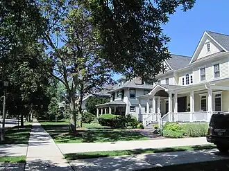 The La Grange Village Historic District is a national historic district encompassing a large section of the village of La Grange, Illinois. The district includes over 1000 buildings, most of which are residences. Development in the district began in the 1870s after the Chicago, Burlington and Quincy Railroad began serving two stations in La Grange; nearly all of the buildings within the present-day district were built between then and 1930. Several popular architectural styles of the period are represented in the district, including large collections of Prairie School, Queen Anne, and Victorian houses. The district includes three designs by Frank Lloyd Wright as well as works by John S. Van Bergen, Enock Hill Turnock, and J. C. Llewelyn.[2]