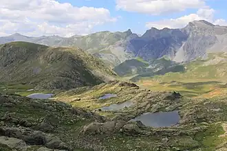 Lakes of Morgon (Tinée, French Alps). Left: the Big Lake of Morgon (2427 m) ; center: the Median Lake (2470 m) and the Higher Lake (2480 m).