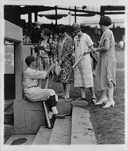 Future Hall of Famer Bucky Harris signing scorecards for women attendees on Ladies' Day, 1925