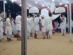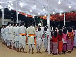 Lai Haraoba (Meitei: ꯂꯥꯏ ꯍꯔꯥꯎꯕ, Bengali: লাই হরাওবা) is a traditional cultural and religious festival celebrated by the Meitei people in Bangladesh. The festival honors the gods and spirits of Sanamahism, the traditional Meitei pantheon, through a series of rituals, music, and dance. It is characterized by classical Manipuri dance, devotional songs, and the use of traditional instruments, such as the pung (drum). Lai Haraoba, being a Meitei intangible cultural heritage, serves as an important cultural event for the Meitei diaspora in Bangladesh, playing a key role in the preservation and transmission of Meitei religious and cultural practices.[1][2][3]