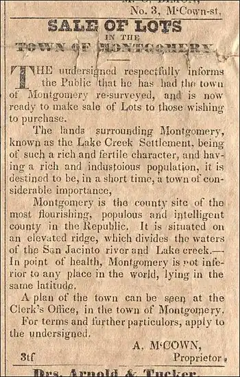 Advertisement for the sale of lots in the Town of Montgomery, Texas, Telegraph and Texas Register newspaper, July 8, 1837, published in Houston, Texas.