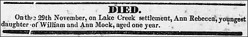 Death notice of Ann Rebecca Mock, Lake Creek Settlement, as reported in Telegraph and Texas Register newspaper, December 17, 1836.
