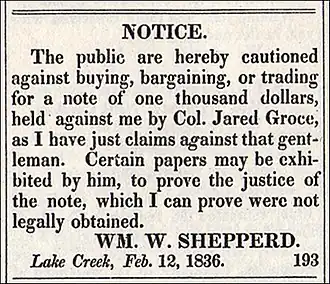 Advertisement by William W. Shepperd, a merchant in Lake Creek during the Texas Revolution. This was published in the March 17, 1836 edition of the Telegraph and Texas Register newspaper, printed at San Felipe de Austin, Texas. (For context, the Battle of the Alamo began on February 23, 1836.)
