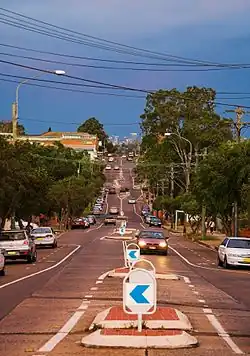 Canterbury Road winds its way high along the ridge, which is the boundary of the watersheds of Cooks River and Wolli Creek to the south. It is near the shopping centre on Haldon Street.