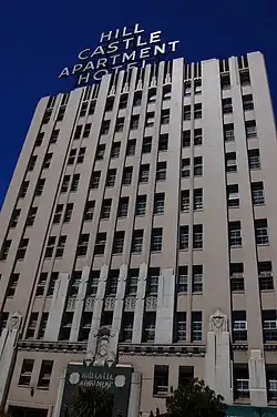 The district has an outstanding concentration of club buildings, historic luxury apartments, and a significant cluster of Deco structures,[6] including the terra cotta Charles Jurgens Co. building, the Elks Hall on Alice Street (now the Malonga Casquelord Arts Center), the Hill Castle Apartments on Jackson Street, The Hotel Harrison on Harrison Street, the Scottish Rite Center at the lake's edge on Lakeside Drive, the Alameda County Courthouse in the neighboring Civic Center district, which also features the Civic Center Post Office on 13th Street. The "Ideal Cleaners" shop features a neon sign and period appointments in the Art Deco style. Many of these historic buildings are protected as official city landmarks.[7][8] During a city Cultural Heritage Survey in the 1980s most of the district was designated as featuring historically significant architectural resources. The Survey was conducted by the city of Oakland's Planning Department and its Landmarks Preservation Advisory Board from 1980 to 1985.[1] Other historic places include the Victorian Camron-Stanford house on the shore of Lake Merritt at 14th Street and Lakeside Drive, the Municipal Boathouse on Lakeside Drive, the Greek revival Scottish Rite Center on Lakeside Drive, the eleven story Bechtel Building at 244 Lakeside, the Alician apartments on Alice Street with its ornate marble entrance, the Regillus condominiums on 19th street, the mission revival Scottish Rite Temple on Madison Street, and the historic Schilling Gardens on 19th Street.