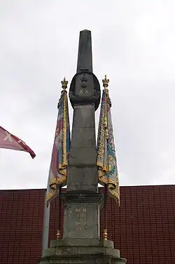 The memorial was built by John Tinline of Bury, a local stonemason. It consists of a single tall, tapering obelisk in Portland stone (similar to the pair on Lutyens' Northampton War Memorial) standing on a square base with a cornice where the two parts meet. Below the base is a carved frieze which sits on a pedestal of two rectangular blocks. The whole structure rests on a rectangular plinth and at the very bottom are two shallow circular steps. On the front and rear of the obelisk are carvings of the Lancashire Fusiliers' cap badge and the inscription "XX" (referring to the 20th Regiment of Foot, from which the Lancashire Fusiliers evolved) in gilded lettering, surrounded by a carved laurel wreath. On the front, below the wreath, the regiment's motto, OMNIA AUDAX ("daring in all things", awarded for the fusiliers' service in the Second Boer War), is inscribed. To either side are carved, painted flags: the King's Colour to the north (left when the memorial is viewed from the front) and the colour of 1st Battalion, the Lancashire Fusiliers to the south (right). The obelisk itself is 4 metres (13 ft) tall and the whole memorial is 6.9 metres (23 ft) tall.[1][16][17][18][19]