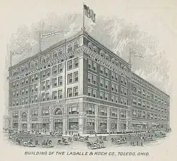 Lasalle's traces its beginnings to a store opened in 1865 by Jacob Lasalle and Joseph Epstein, at 51 Summit Street. In 1883, Joseph Koch joined the business, which relocated to a new store at the corner of Summit and Adams Streets. In 1900, the Lasalle & Koch Co. opened a new store at the corner of Jefferson Avenue and Superior Street. This store was enlarged several times, and in 1916, ground was broken for a new store at Adams and Huron Streets.[1]