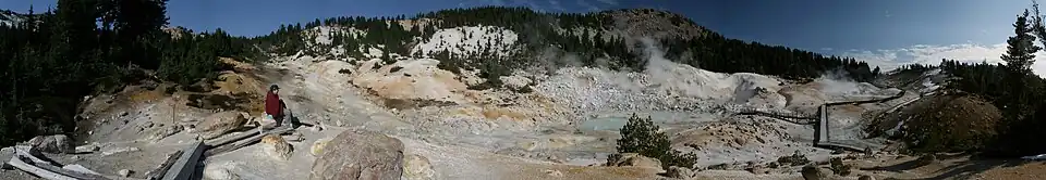The source of heat for the volcanism in the Lassen area is subduction of the Gorda plate diving below the North American plate off the Northern California coast.[5] The area surrounding Lassen Peak is still active with boiling mud pots, fumaroles, and hot springs.[6]
